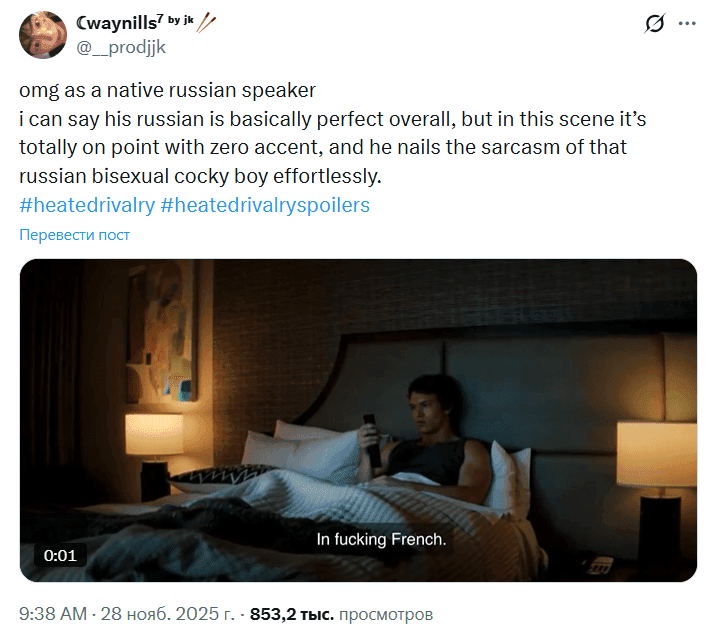 Теперь русскоязычные пользователи X шутят, что сериал про геев-хоккеистов — именно то, что нужно было для продвижения русской культуры и русского языка на Западе. За почти четыре года войны и десятилетия стереотипизации в голливудских фильмах россияне устали быть злодеями. Они ждали позитивной репрезентации в медиа — и нашли её в неожиданном месте. «Главная традиционная ценность человеческого общества — яой», — иронизируют россияне.